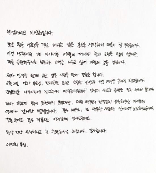 이연희는 “조심스러운 시기이기에 간소하게 예식을 치르며 인생의 새로운 출발을 맞이하려고 한다”며 “결혼 후에도 좋은 작품으로 여러분께 인사드리겠다. 항상 건강 유의하시고 늘 행복하시길 바란다”고 마무리했다.