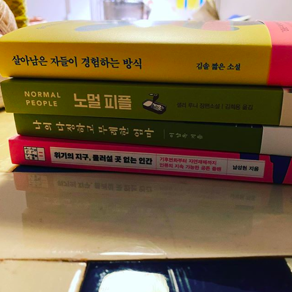 사진에는 책 4권이 쌓여져 있는 모습이었는데 해당 책의 제목은 다음과 같았다. '살아남은 자들의 경험하는 방식', '노멀 피플', '나의 다정하고 무례한 엄마', '위기의 지구 물러설 곳 없는 인간'