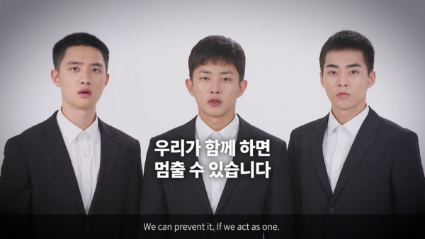 영상 속 엑소 디오, 시우민 그리고 배우 김민석은 '성 착취물은 우리 삶을 파괴하는 바이러스입니다. 나도, 내 가족도, 내 친구도, 이 바이러스에 안전할 순 없습니다. 보는 것도, 사는 것도 멈춰주세요. 외면하지 말고 방관하지 말고. 그건 잘못된 거라고 범죄라고. 당장 멈추라고 말하세요. 우리가 함께 하면 멈출 수 있습니다.'라고 말하며 성 착취물 근절 캠페인에 동참했다.