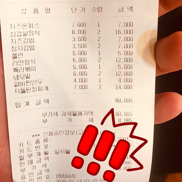 [스타인뉴스 서관민 인턴기자] 오늘 오후 가수 테이의 인스타그램에 알 수 없는 계산서 영수증 한장이 게시되었다. 계산서에는 돈까스, 김밥, 쫄면 등등 총 15인분의 분식 음식 명세서목록이 가득했다.