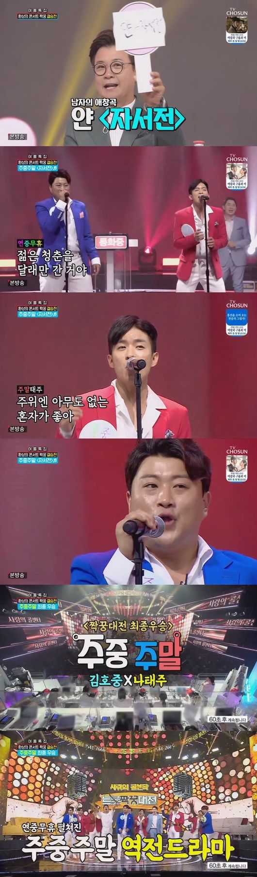 마침내 상위 3팀인 장민호·노지훈, 김호중·나태주, 영탁·류지광이 ‘자유곡 대결’로 진행되는 결승전에 진출, 기존의 점수는 리셋 됐던 상태. 장민호·노지훈은 조은새 ‘하트 하트’로 애교 만점 하트 댄스까지 전파하며 92점을, 김호중·나태주는 얀의 ‘자서전’을 파워풀하고 상남자답게 열창해 98점을, 영탁·류지광은 싸이 ‘연예인’으로 모두가 즐기는 열광의 무대를 이끌어 91점을 받았다. 결국 ‘환상의 트롯 짝꿍’ 특집 최종 우승은 김호중·나태주가 거머쥐며 반전을 거듭한 결과를 안겼다.