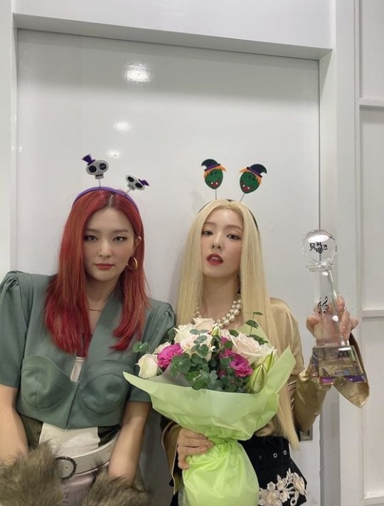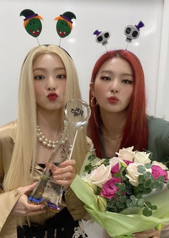 공개된 3장의 사진 속 아이린과 슬기는 꽃다발과 뮤직뱅크 1위 트로피를 들고 카메라를 향해 귀여운 표정을 짓고 있다.