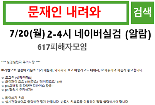 부동산 정책을 비판하는 한 인터넷 카페 회원들은 '실검 챌린지'를 지속해서 벌이고 있다. 실검 챌린지는 지정한 시간대에 특정 단어를 계속 검색해 실검 상위권에 올리는 것이다. 이날 오후 2시께는 '문재인 내려와'가 실검에 올라왔다.