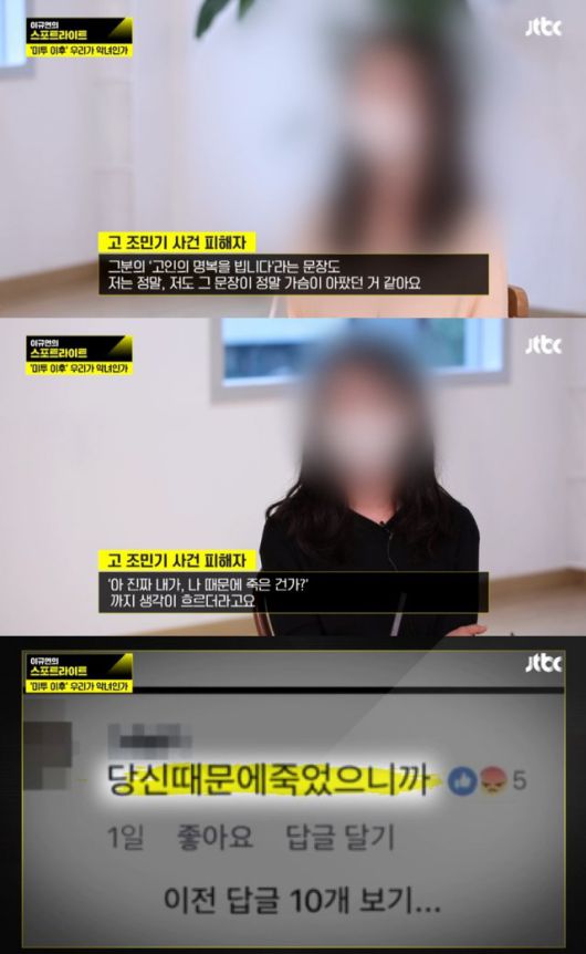 방송을 통해 피해자는 “악플 내용은 다 똑같았다”며 “꽃뱀이라고 했다”고 조민기의 사망 이후 상황을 토로했다.