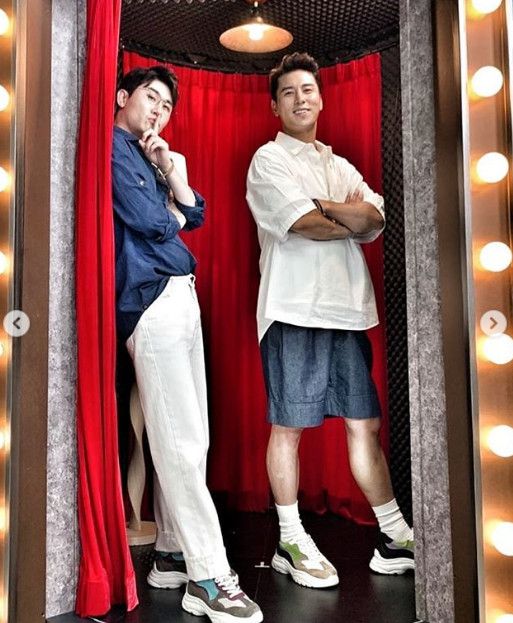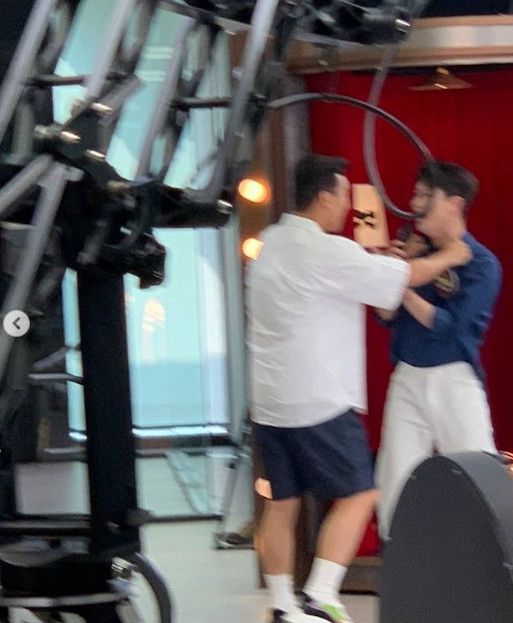 게재된 사진에는 '히든싱어 6' 녹화장에서 포즈를 취하고 있는 영탁, 장민호와 영탁의 멱살을 잡고 있는 장민호의 모습이 담겨있다.