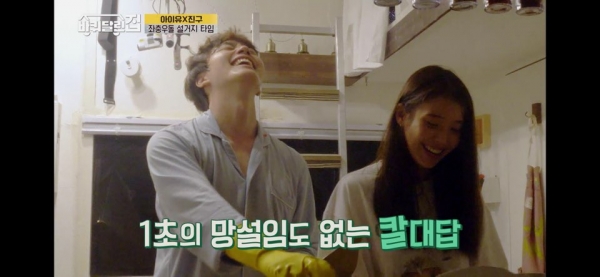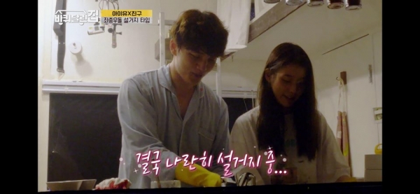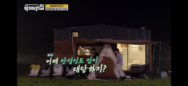진구와 아이유는 다정하게 설거지를 하며 하루를 마무리 했다. 이때 갑자기 '성동일'은 아이유에게 우리 세 사람 중 이상형을 굳이 꼽자면 이라는 말이 끝나기도 전에 아이유는 '진구요 진구'라고 말하며 웃음을 자아냈다. 아이유와 진구는 바퀴달린 집에서 동일과 희원은 텐트를 치고 잠을 청했다.