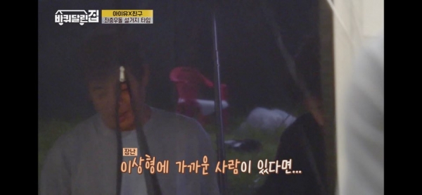 김희원은 아이유에게 진구의 부탁때문에 여기 온거냐며 두 사람의 우정을 확인했다. 절친인 아이유의 방문으로 잘하고 싶은 모습을 보이고 싶은 진구는 말 없이 일에 열중하며 맛있는 식사를 대접하려고 노력했다. 진구가 야심차게 만든 능이버섯밥은 다 익지 않았고 약돌 삼겹살은 불이 너무 세서 연기가 너무 많이 나는 등 애로 사항이 있었다. 엎친 데 덮친 격으로 비까지 와 타프를 다시 설치해야 하는 상황도 발생했지만 네 사람은 재밌는 시간을 보냈다. 또 아이유의 부모님이 직접 재배한 채소들과 김치와 함께 더 풍성한 식사를 했다.