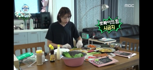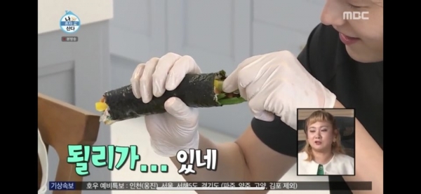 그녀는 먼저 김밥을 쌀 준비를 했다. 다 태워먹은 계란 지단과 시금치를 후라이팬에 데치는 과격한 모습에 패널들은 웃음을 참지 못했다. 그래도 나름 김밥의 모양은 보기좋게 만들어졌다. 그런데 그 때 김밥에 깜빡 잊고 오이와 당근을 넣지 않은 연경은 특유의 쿨함으로 김밥에 꽃꽂이를 하듯 재료를 쑤셔 넣었다. 신기하게도 재료들이 쏙 들어가버렸다.