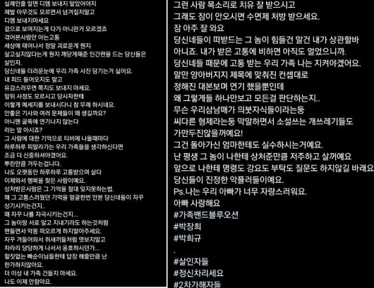 이어 그는 "그 사람에 대한 기억으로 티비에 나올 때마다 하루하루 피말라가는 우리 가족들을 생각하신다면 조금 더 신중하셔야겠어요. 나도 오랫동안 하루하루 고통받으며 살다 이제와서 행복을 찾은 사람이에요. 상처받은 사람은 그 기억을 절대 잊지 못하는 법. 편들면서 악몽 떠오르게 하지 말아주세요"라고 덧붙였다.