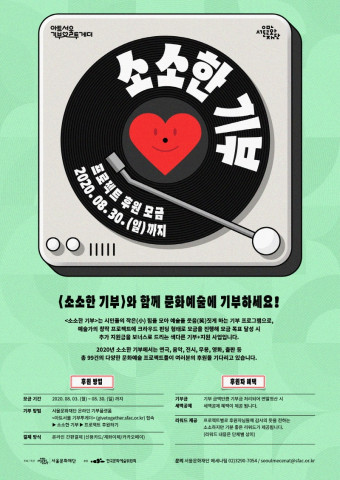 [스타인뉴스 김학철 기자] 서울문화재단(대표이사 김종휘)이 누구나 문화예술 프로젝트의 후원자가 될 수 있는 <소소한 기부>의 모금을 30일까지 진행한다.