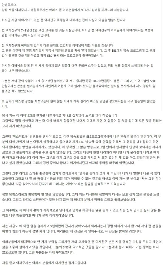 그는 "전 여자친구와 7~8년 전 2년여간 교제를 한 것은 사실이다. 하지만 전 여자친구의 아버님께서 이야기하시는 폭행에 관한 이야기는 전혀 사실이 아니다. 전 여자친구와 헤어짐에 있어서 다른 문제도 있었지만 아버님에 대한 이유도 컸다"라며 "아버님을 알게 된 후 제가 원하지 않은 일들에 대한 무리한 요구가 있었고, 정말 저를 힘들게 느껴지게 하는 일들이 너무 많았다"라고 말했다.
