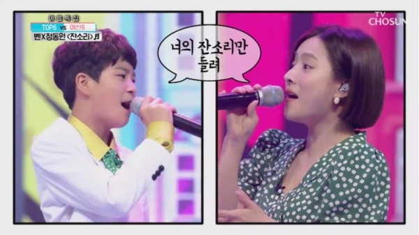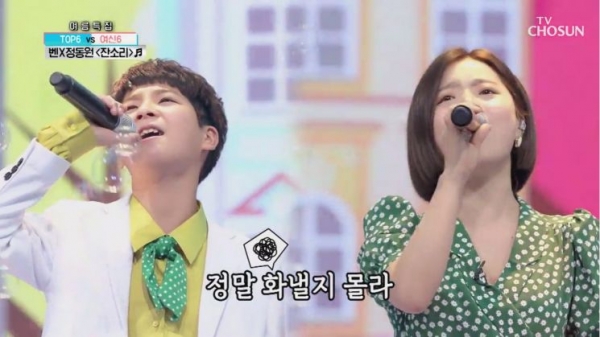 또 벤은 양 팀 막내들의 특별 공연 주인공으로 나서기도 했다. 그는 TOP6((임영웅, 영탁, 이찬원, 정동원, 장민호, 김희재)의 막내 정동원과 함께 아이유X임슬옹의 ‘잔소리’ 듀엣 무대를 펼쳤고, 정동원과 함께 환상 호흡을 자랑했다.
