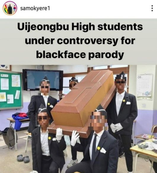 의정부고 학생 5명은 얼굴을 검게 칠하고 선글라스를 쓴 채 가나의 장례풍습을 따라 하고 있다. 사진이 공개된 후 얼굴을 검게 칠한 ‘블랙페이스(black face)’ 분장이 인종차별적 요소를 담았다는 비판이 나온 것.