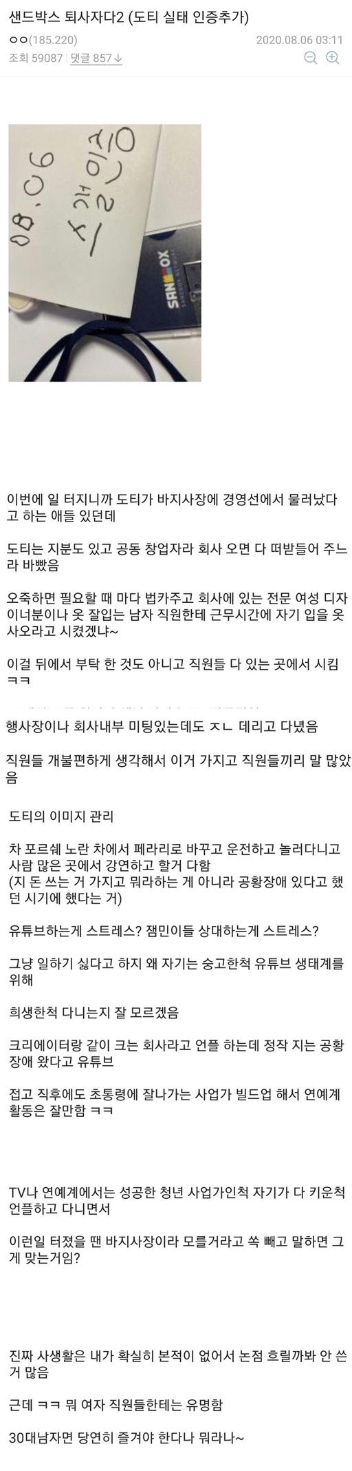 작성자는 샌드박스 직원 목걸이를 인증하면서 “도티가 CCO(콘텐츠 최고 책임자)인데 소속 유튜버가 뒷광고 한 걸 전혀 몰랐을 리가 없다”면서 도티도 뒷광고를 해왔다고 주장했다.