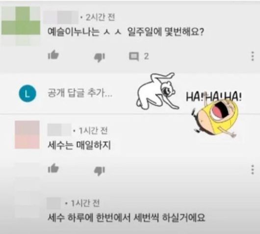 이 누리꾼은 '예슬이 누나는 ㅅㅅ 일주일에 몇 번 해요?'라고 했고, 또 다른 누리꾼들이 "세수는 매일하지", "세수 하루에 한 번에서 세번씩 하실거에요"라고 칼같은 답을 달았다.