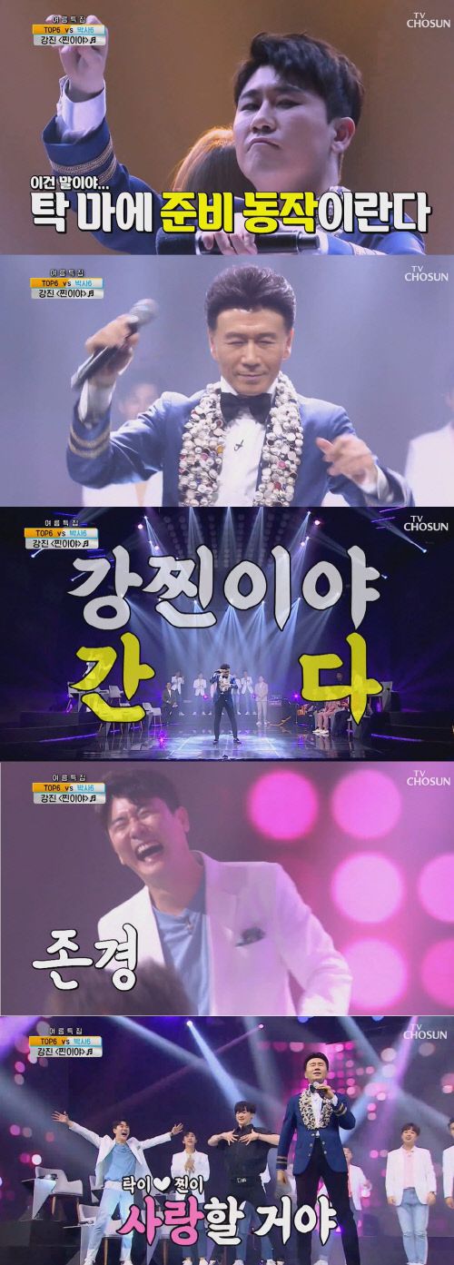 이날 강진과 영탁의 승부가 펼쳐졌다. 강진은 영탁에 대해 "정말 사랑하는 후배다. '막걸리 한 잔'을 불러줘서 얼마나 고마운지 모른다. 제 친아들 같은 후배다"라며 애정을 보였다.