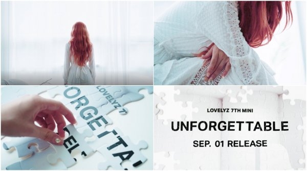 공개된 영상에는 붉은 계열의 헤어스타일과 하얀색 드레스를 입은 여성이 'LOVELYZ 7TH MINI', 'UNFORGETTABLE', 'SEP. 01 RELEASE'라고 적힌 퍼즐을 맞추는 모습이 담겼다.