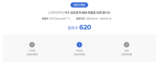 청원자는 코로나19 확산 상황에서도 KBS가 김호중이라는 가수 1인을 위해 대규모 팬미팅을 아레나홀과 제2체육관에서 3일 연속 진행하도록 방치한 점, 김호중의 조폭, 유학, 가족사 등을 둘러싼 과거 의혹, 전 매니저와의 소송, 군 입대 논란 등을 짚었다.