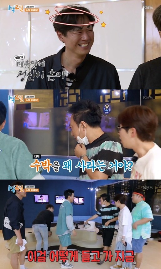 23일 오후 방송된 KBS 2TV 예능 프로그램 '1박 2일 시즌4'(이하 '1박 2일')에는 박명수에게 수박을 파는 멤버들의 모습이 그려졌다.