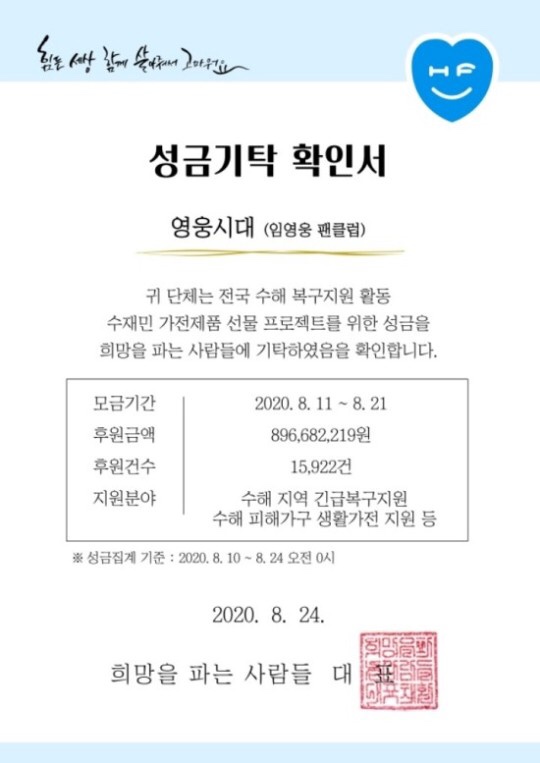 [스타인뉴스 이정명 인턴기자] 가수 임영웅 팬클럽 '영웅시대'가 수재민을 돕고자 약 8억 9천만원을 기부했다.