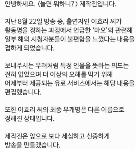 결국 '놀면 뭐하니' 제작진이 공식입장을 내고 논란을 진화하고 나섰다. '놀면 뭐하니' 제작진은 공식 SNS를 통해 입장을 내고 "지난 8월 22일 방송 중, 출연자인 이효리 씨가 활동명을 정하는 과정에서 언급한 ‘마오’와 관련해 일부 해외 시청자분들이 불편함을 느꼈다는 내용을 접하게 되었습니다"라며 "보내주시는 우려처럼 특정 인물을 뜻하는 의도는 전혀 없었으며 더 이상의 오해를 막기 위해 어제부터 제공되는 유료 서비스에서는 해당 내용을 편집했습니다"라고 밝혔다. 이들은 "이효리 씨의 최종 부캐명은 다른 이름으로 정해진 상태"라며 "제작진은 앞으로 보다 세심하고 신중하게 방송을 만들겠습니다"라고 덧붙였다.