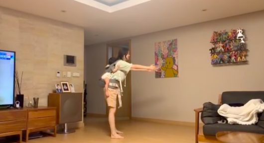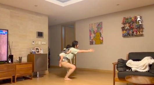 육아와 홈트레이닝을 동시에 한다는 의미인데, 그녀가 올린 동영상을 보면 아기를 등에 업고 스쿼트를 하고 있는 모습이 담겨 있다.