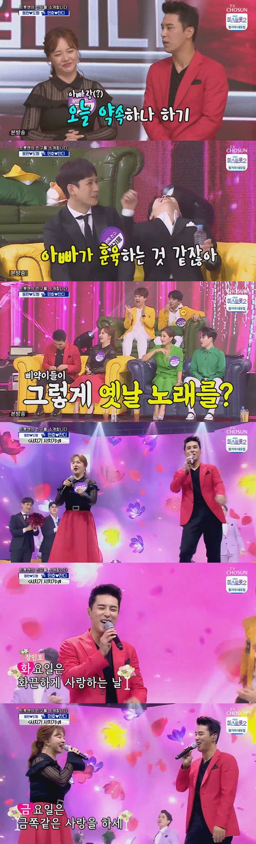 이날 트롯맨의 친구들이 등장해 듀엣 무대로 대결을 펼쳤다. 먼저 김희재의 친구로는 이모 서지오가 등장했고, 이찬원은 황윤성, 장민호의 찐친으로는 미모의 트롯가수 금잔디가 지원사격을 나왔다. 정동원은 임도형이, 영탁의 친구는 배우 박기웅이 출연했다.