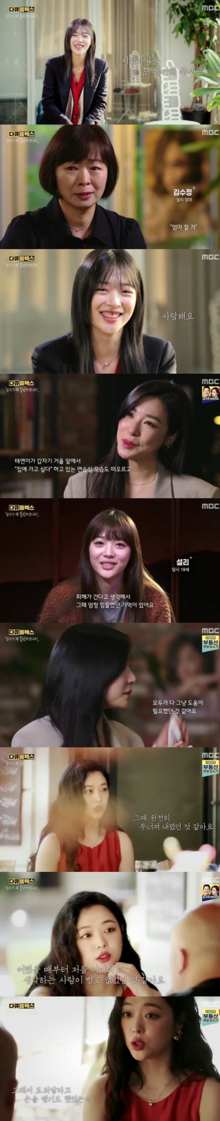 10일 MBC ‘다큐플렉스’는 ‘설리가 왜 불편하셨나요?’ 편으로, 지난해 10월 세상을 떠난 설리의 삶을 돌아봤다. 설리의 엄마 김수정씨와 가수 티파니 영, 그 외 설리의 친구들과 연예 기자, 문화 평론가 등이 목소리를 더했다.