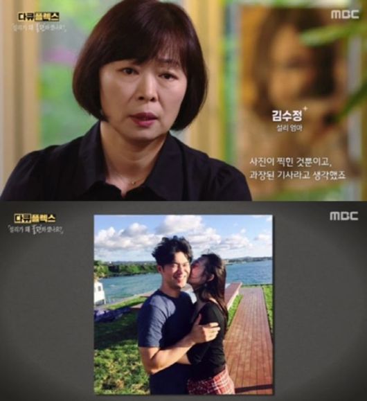 10일 '다큐플렉스'에선 설리의 어머니가 출연해 과거 설리와 최자의 열애설 당시에 대해 언급했다. 설리의 어머니는 당시 "저는 안 믿었다. 사진을 보고도 '오보다. 사진이 찍힌 것뿐이고 과장된 기사'라고 생각했다"며 설리로부터 사실이라고 전해 들었다고 밝혔다.