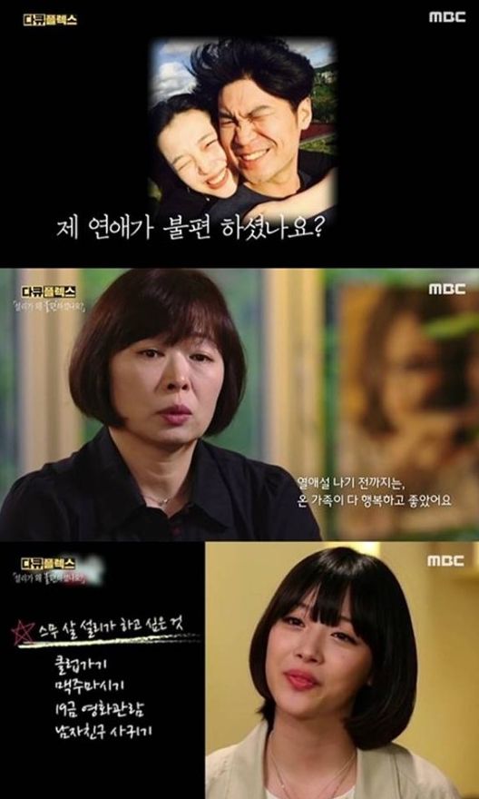 지난 10일 방송된 MBC ‘다큐 플렉스’에는 설리의 25년 인생이 담겼다. 설리의 주변인들은 경제적으로 넉넉하지 못했던 과거부터 연습생 시절, 앓고 있던 마음의 병까지 자신이 알고 있는 설리의 모든 것에 대해 이야기했다.