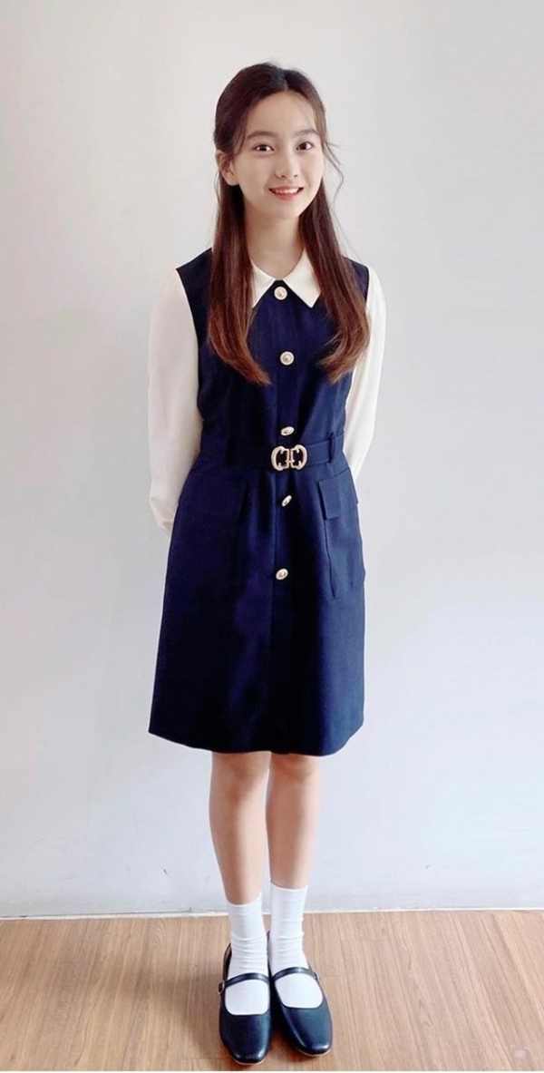공개된 사진 속에는 화이트 블라우스와 네이비 색상이 어우러진 원피스를 입고 미소를 지은 채 카메라를 응시하는 갈소원의 모습이 담겨있다.