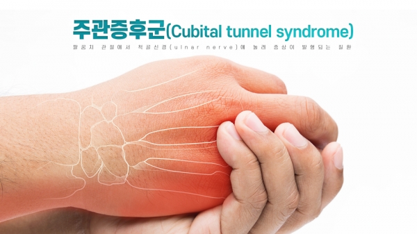 척골신경은 손가락을 모으고 구부리는 등 여러 정밀한 손동작을 수행하는 역할을 하며 무엇보다 4,5번째 손가락의 감각을 담당한다. 이 신경은 팔꿈치 안쪽 내상과(medial epicondyle) 밑으로 지나고 피부와 가깝게 위치해 있다 보니 팔꿈치 관절을 구부린 채로 오래 있게 되면 눌리면서 손상을 받기 쉽다. 이처럼 척골신경이 팔꿈치 부위에서 압박, 긴장, 마찰 등에 의해 압박성 신경병증을 일으키는 질환이 주관증후군이라고 한다. 4번째 손가락 척측과 5번째 손가락 저림, 감각이상, 약력감소 등이 나타나게 되는데 만성으로 진행할 경우에는 손가락 안쪽 근육 마비 증상이 나타날 수 있고 갈퀴모형의 손가락 변형도 생길 수 있다.