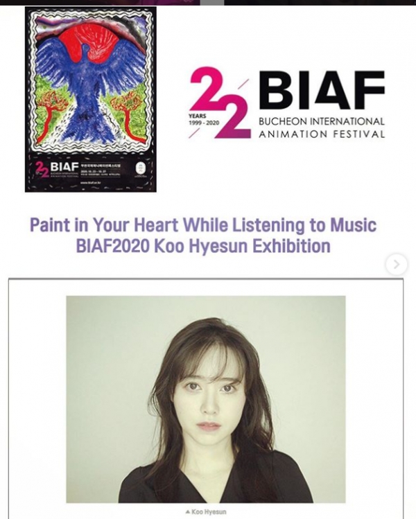 구혜선은 얼마 전 제22회 부천국제애니메이션페스티벌(이하 BIAF2020) Ani-마스터展’-구혜선 특별전<imagine>을 개최한다는 소식을 전하기도 했다. 해당 행사는 10월 18일~10월 25일 <한국만화박물관 1층 제2기획전시실>에서 볼 수 있으며 한국만화박물관에는 볼거리가 정말 많고 자신의 전시는 언제나 편안한 마음으로 겸사겸사 보시길 바란다는 이야기를 전했다.