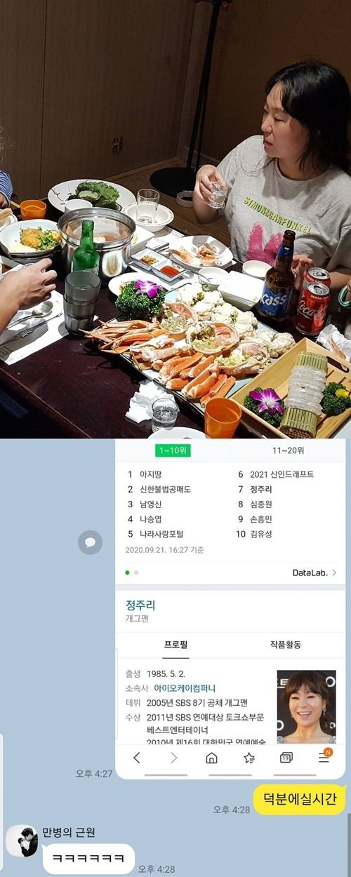 정주리는 새로운 게시물을 올리며 상황을 수습하려고 했다. 정주리는 “남편이 담날 대게사준거 올릴껄 워워”라는 글과 함께 남편과 대게에 술을 먹는 사진을 게재했다.