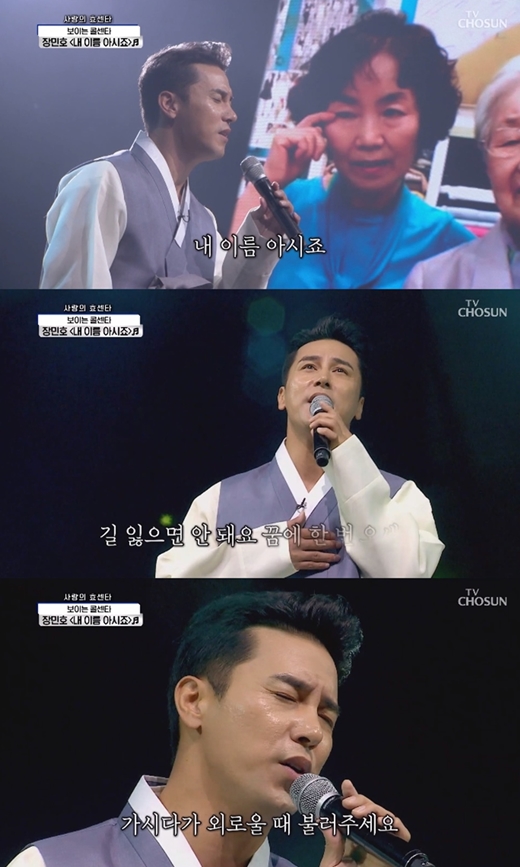 장민호는 지난 24일 오후 방송된 TV조선 ‘신청곡을 불러드립니다-사랑의 콜센타’(이하 사랑의 콜센타)에서 100세 팬이 신청한 자신의 자작곡 ‘내 이름 아시죠’를 열창해 화제를 모았다.