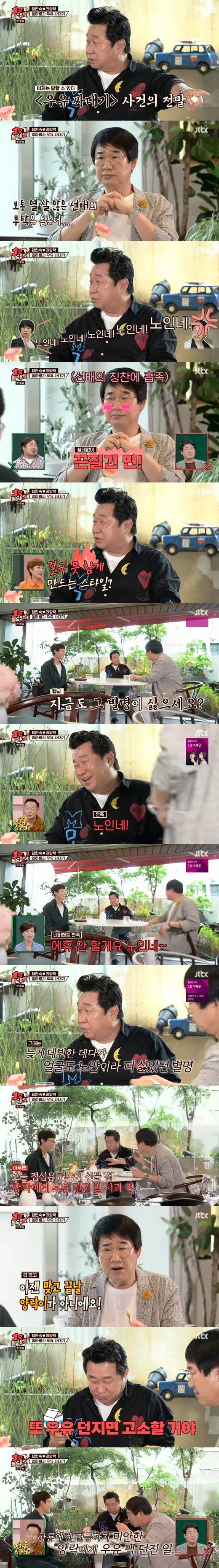 최양락은 “형님, 지금도 그 별명이 싫으시냐”고 물으며 임하룡에게 한번 더 노인네라고 부르며 “지금은 안 할게요. 노인네”라고 말했다. 이어 “또 우유 던지면 고소할 거다”라고 최양락 특유의 ‘깐족’을 보여줬다.