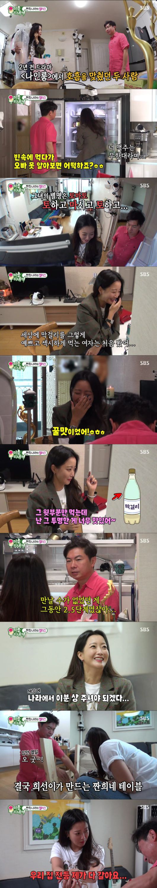 김희선은 혼자 사는 임원희를 위해 반찬까지 살뜰히 챙겨 눈길을 끌었다. “직접 만들면 좋겠지만 내가 직접 골라서 샀다"고 말해 웃음을 안겼다. 또, 냉장고 속 맥주를 보고 좋아하는 희선에게 원희가 “마시라”고 하자 “빈 속에 먹다가 오빠 못 알아보면 어떡하지?”라고 걱정을 했다. 이에 원희는 “너 맥주는 무한대라며…”라며 애주가 김희선의 별명 토마토(토하고 마시고 토하고)를 언급해 폭소를 자아냈다.