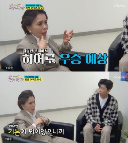 이미자는 "내가 살아 있는 한은 뿌리를 지켜달라고 항상 여러분한테도 얘기하고 후배들한테도 얘기하고 있다. 사람들의 마음을 달래주고 위로해주고 기쁘게 해주는 거는 우리 대중가요다. 다행스러운 게 요새 방탄소년단이 그렇게 하듯이 트롯이라고 뭐 그렇게 안 되겠느냐. 희망을 갖고 지내는 건 좋다"라고 얘기해주며 임영웅의 힘을 북돋아주고자 했다.