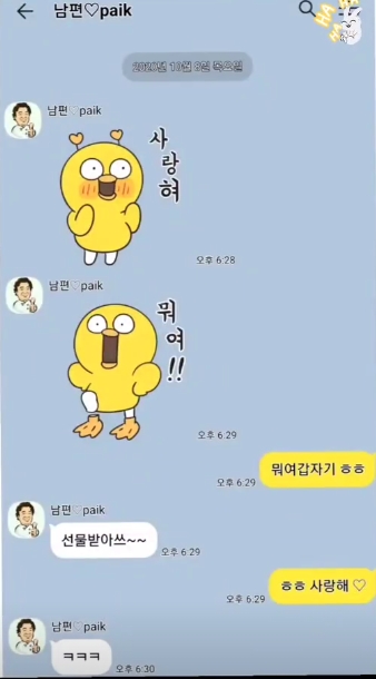 메시지에서 백종원은 '사랑혀' '뭐여'라 말하는 이모티콘을 통해 소유진에게 마음을 전했다. 소유진은 "뭐야 갑자기"라 놀라면서도 "사랑해♡"라 답해 8년 차인데도 여전히 꿀 떨어지는 애정을 드러냈다.
