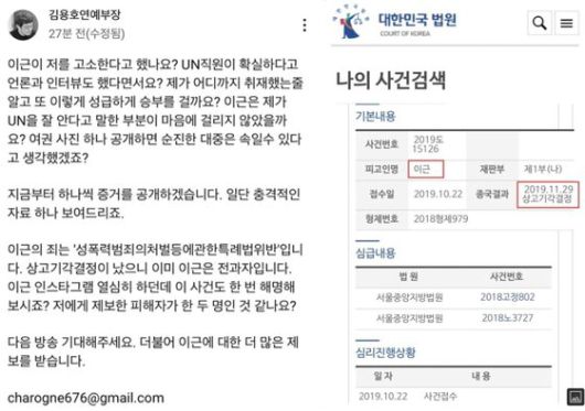 김용호는 12일 자신의 유튜브 채널 ‘김용호 연예부장’ 커뮤니티를 통해 “이근이 저를 고소한다고 했나요? UN직원이 확실하다고 언론과 인터뷰도 했다면서요? 제가 어디까지 취재했는 줄 알고 또 이렇게 성급하게 승부를 걸까요?”라는 글을 올렸다.