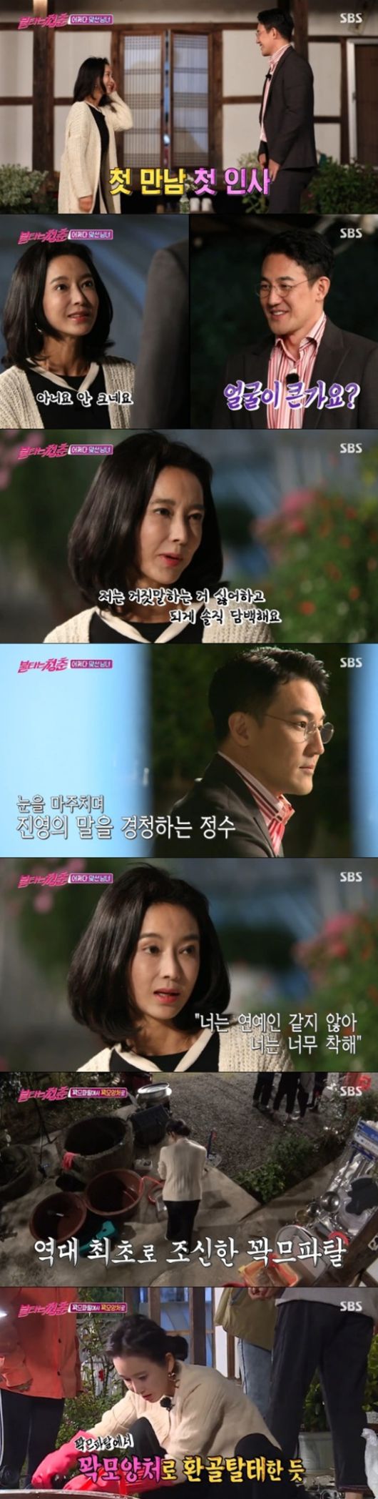 20일 방송된 SBS '불타는 청춘'에서는 곽진영과 한정수의 소개팅 이야기가 담겼다. 곽진영에게 이날 소개팅은 첫 소개팅이었고, 한정수는 20년 만의 소개팅이었다.