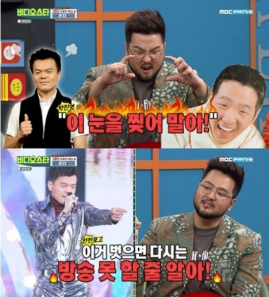 김태우는 "첫 방송을 하고 나서 (박)진영 형이 연습실로 씩씩거리며 찾아왔다. 그리고 내 얼굴을 잡고는 '이 눈을 찢어 말어!' 하더라. 다음 날 고급안경점으로 데리고 가서 안경을 쓰게 했다"고 말했다.