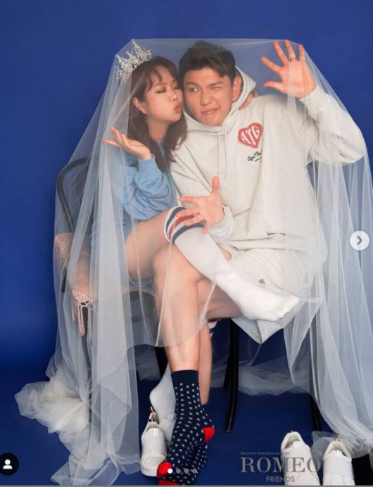 사진 속 홍현희·제이쓴 부부는 의자 위에서 익살스러운 포즈를 취하고 있다.