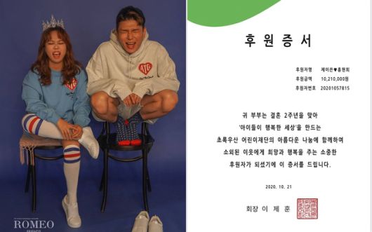 [스타인뉴스 박규범 기자] 개그우먼 홍현희와 인테리어 디자이너 제이쓴 부부가 결혼 2주년을 맞아 1021만원을 기부했다.