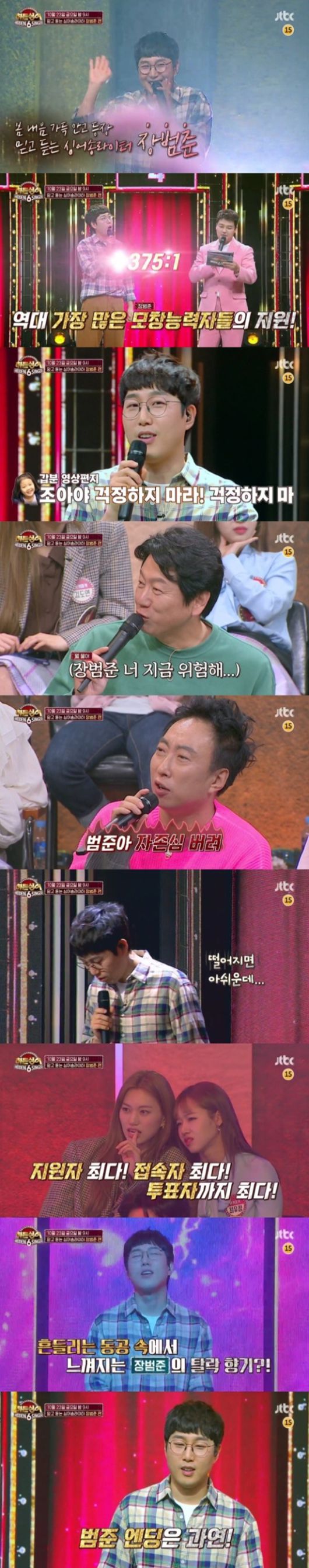 그러나 장범준의 자신감과 달리 모든 통에서 똑같은 목소리가 들려왔고, 통 안의 장범준 본인도 ""뭐야? 기절할 것 같다"며 초조해 하기 시작했다. 무대로 나와 "밖에서...분위기가 어떻죠?"라며 조심스럽게 묻는 장범준에게 판정단 김수로는 "너 지금 위험해..."라고, 박명수는 "자존심 버려. 네가 살아야지 무슨 소리 하는 거야?"라고 말해 위기감을 조성했다. 이에 장범준은 "떨어지면 아쉬운데...아, 맹장이 터질 것 같아"라며 긴장감을 감추지 못했다.