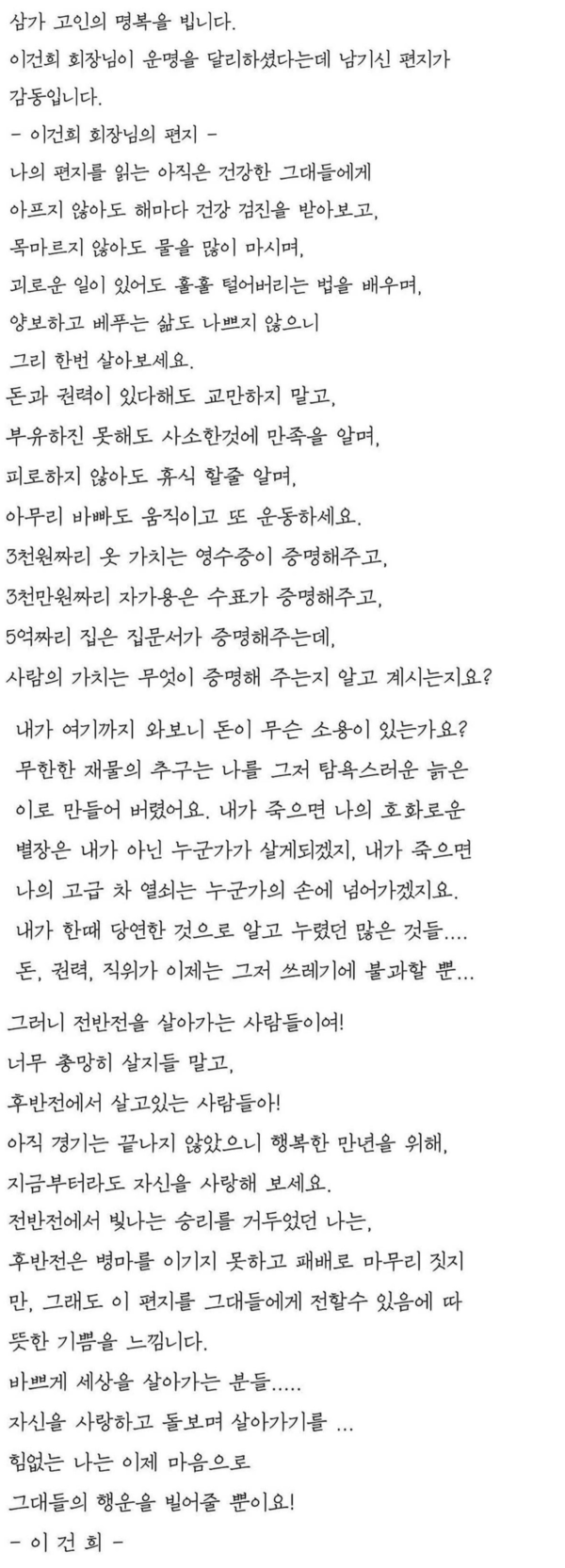 해당 글은 "삼가 고인의 명복은 빈다"며 "이건희 회장님이 운명을 달리했는데 남긴 편지가 감동"이라고 운을 띄우며 편지글을 소개한다.