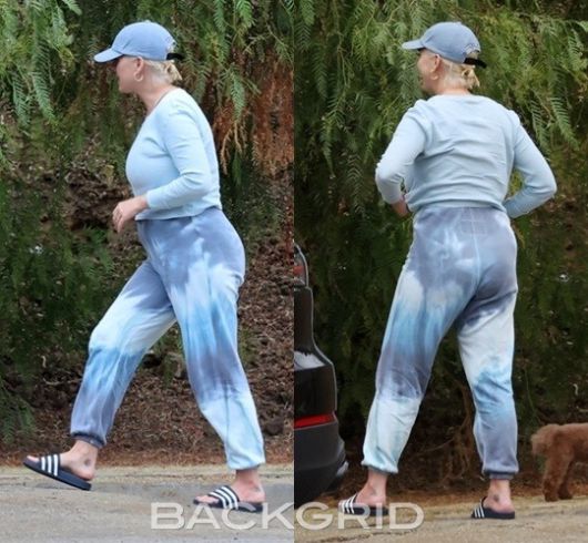 공개된 사진 속 그녀는 편안해 보이는 상의와 바지를 입고 모자까지 쓴 채 이동 중인 모습. 남자친구 올랜도 블룸과 함께 애완견을 산책시키고 있는 것으로 보인다. 아직 부기가 빠지지 않았는지 털털한 비주얼이 시선을 끈다.