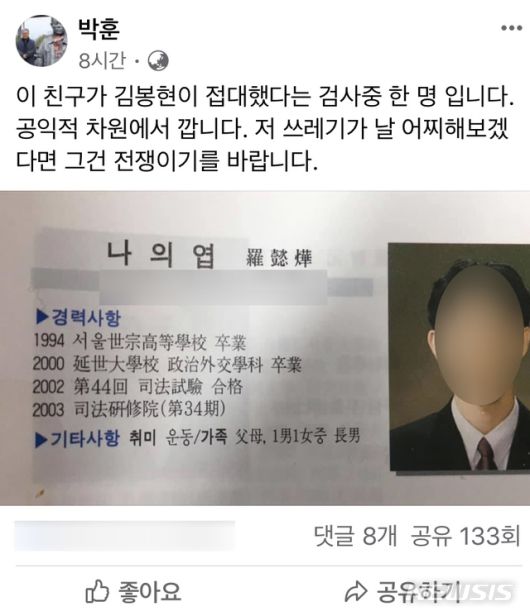 박 변호사는 30일 자신의 SNS에 나의엽 수원지검 안산지청 부부장검사의 사진을 올리며 "이 친구가 김봉현이 접대했다는 검사 중 1명이다. 공익적 차원에서 공개한다"고 글을 올렸다.