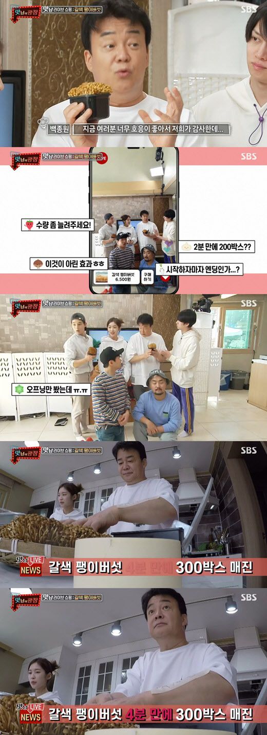 이날 백종원과 농벤져스는 라이브 쇼핑을 진행하기도 했다. 새로운 맛남이 갈색 팽이버섯 300박스를 판매하기 위해서였다. 모두가 생방송 준비를 마치고 카메라 앞에 섰다. 방송이 시작되자마자 맛남이가 순식간에 팔려 나갔다. 결국 4분 만에 준비된 수량이 매진됐다. 제작진은 긴급 회의를 거쳐 추가 물량 200박스를 확보했지만, 이마저도 2분 만에 품절돼 놀라움을 안겼다.