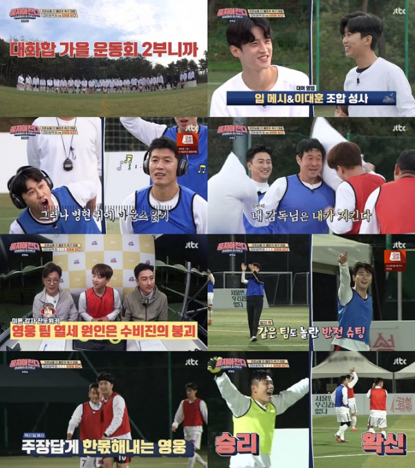 8일 방송된 JTBC ‘뭉쳐야 찬다’에서는 지난주에 이어 트롯맨들과의 가을 운동회 2탄이 진행됐다. 주장 이형택과 임영웅이 중심이 되어 각각 청팀과 홍팀으로 편을 가른 전설들과 트롯맨들은 새로운 동지들과의 팀워크를 다지며 게임부터 경기까지 대결을 펼쳤다.